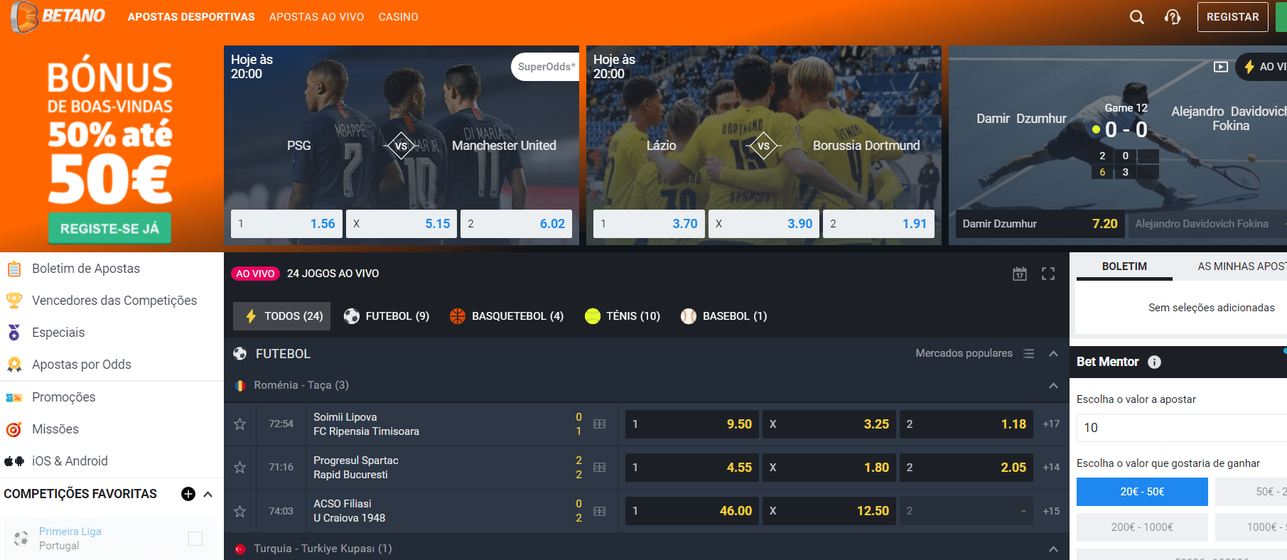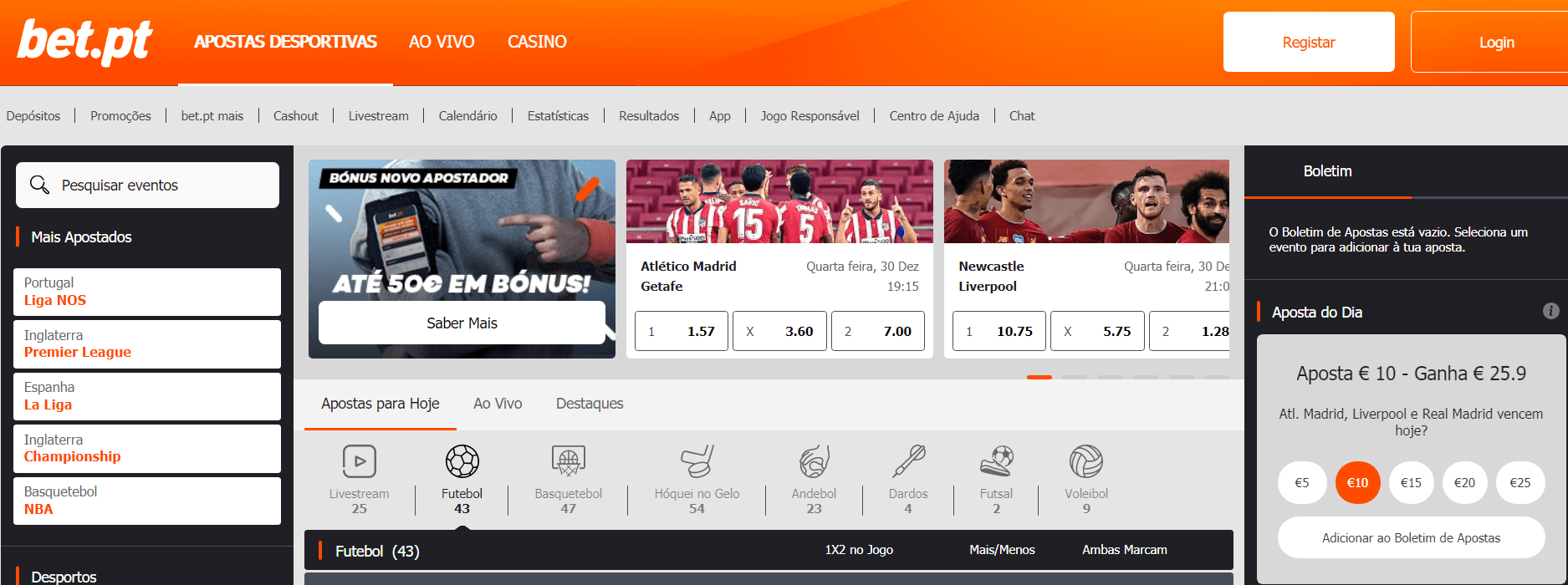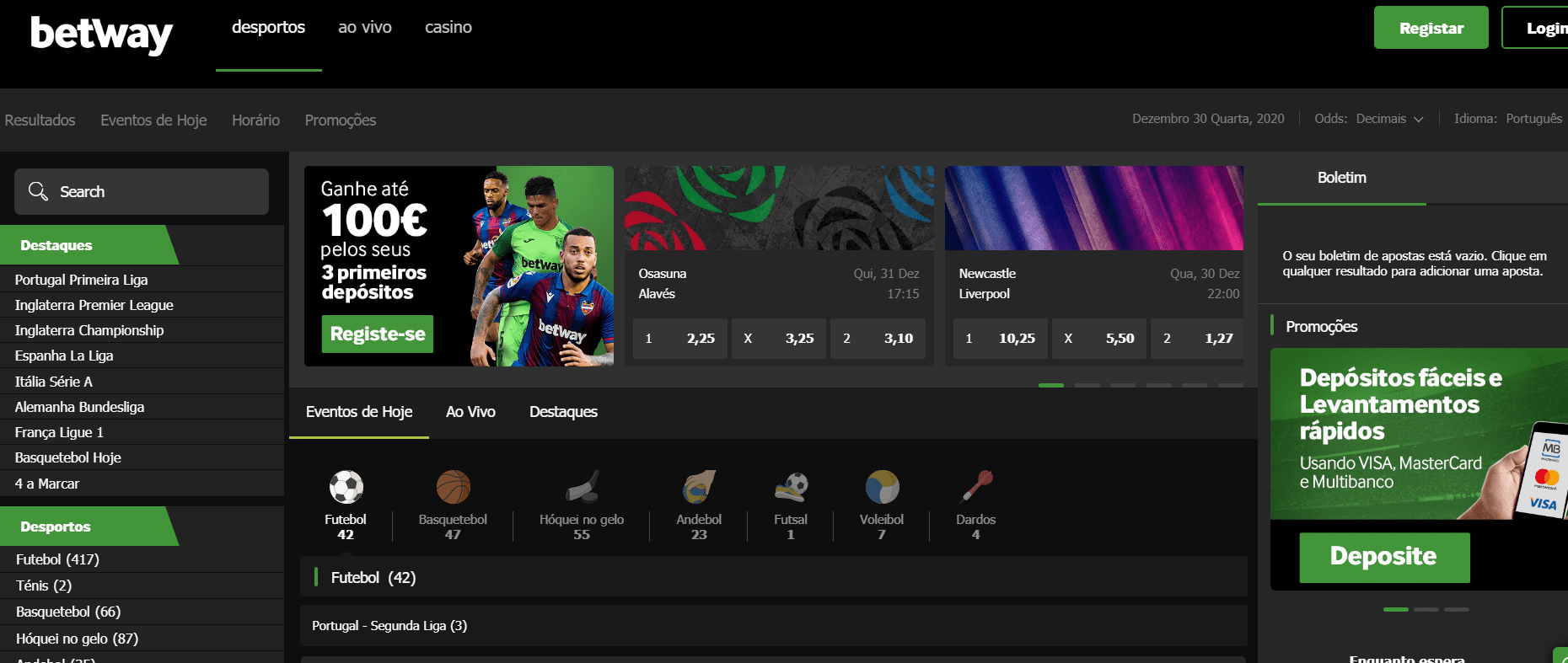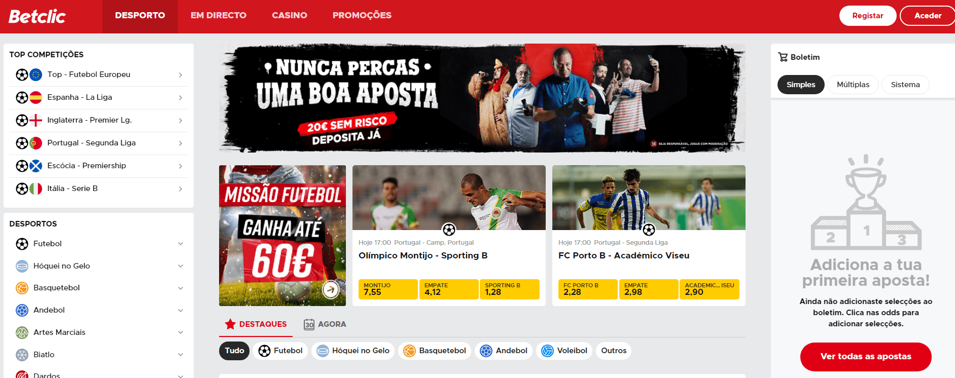 Após o registo na página de Desporto, faça um primeiro depósito mínimo de 10€ e à sua espera estará um Bónus de Desporto de 100% até 50€