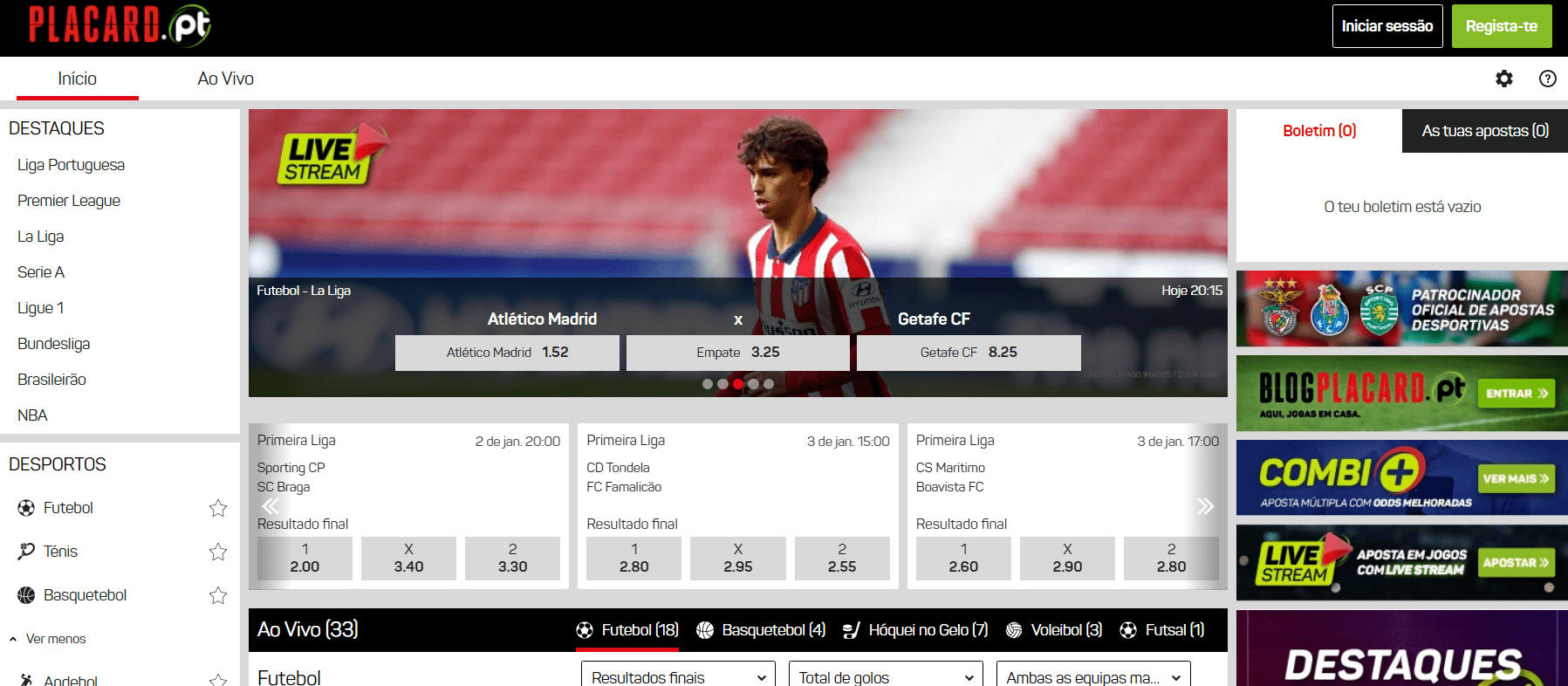 Em Portugal, os sites licenciados oferecem apostas pré-jogo e ao vivo, promoções exclusivas e bónus atrativos. Além do futebol nacional e europeu, há opções em ténis, basquetebol, hóquei, MMA, golfe e muitos outros desportos.